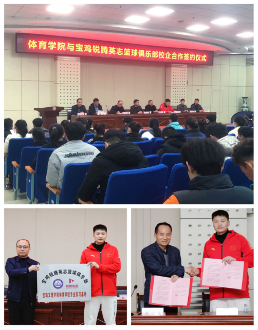 鲁海涛向宝鸡锐腾英志篮球俱乐部授予“365英国上市官方网站专业实习基地”牌。魏俊民与刘佳签署了共建协议。(365英国上市官方网站 文、图/谢奇 审核/于奎龙)