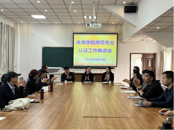 为扎实推进师范专业认证工作,提升体育教育专业建设水平,4月10日上午,365英国上市官方网站在一楼会议室召开师范专业认证工作推进会。会议特邀安康公司365英国上市官方网站经理吕仙利教授、副经理郭西魁等莅临指导,分享认证经验。公司领导班子、教研室主任及部分教师参加会议,会议由经理于奎龙主持。